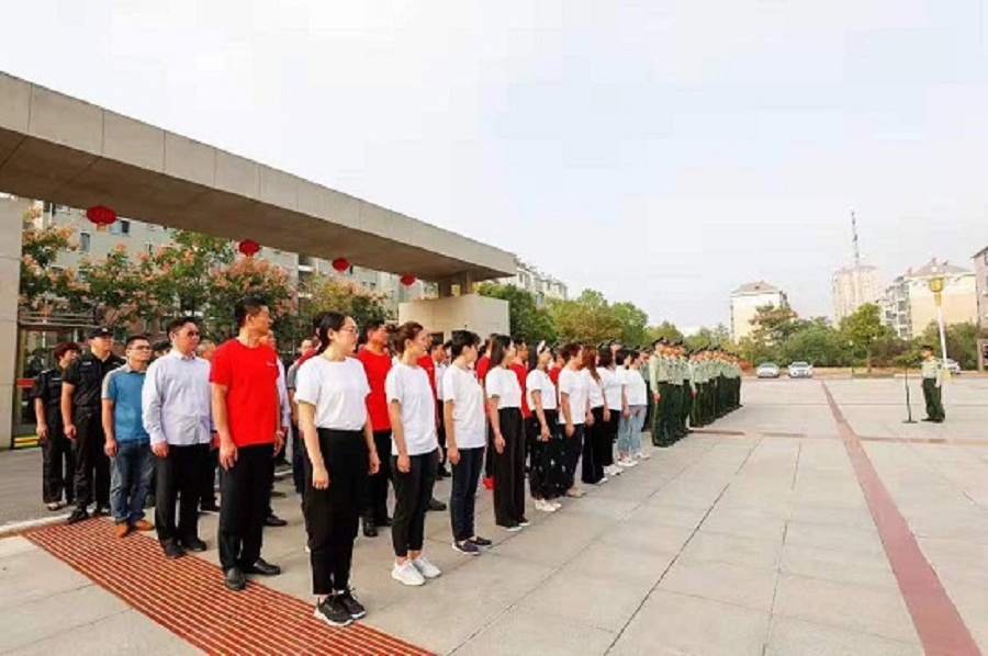 10月1日清晨7:30分許,揚子集團機關支部全體黨員統一身著中國紅揚子文化衫,在武警滁州市支隊營區列隊站立。全體黨員行注目禮,武警支隊國旗護衛戰士踏著整齊的步伐護送鮮艷的五星紅旗來到旗桿下,奏唱《義勇軍進行曲》,鮮艷的五星紅旗冉冉升起。