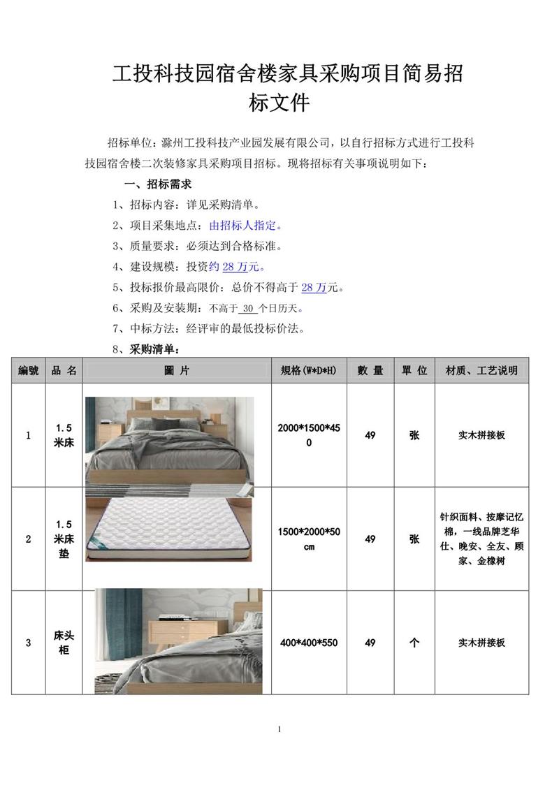 工投科技園宿舍樓家具采購項(xiàng)目簡(jiǎn)易招標(biāo)文件